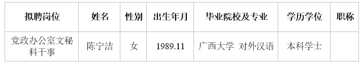 根据《关于印发< 广西壮族自治区事业单位公开招聘人员实施办法>的通知》(桂人社发[2011]155号)及《广西银行学校2018年冬季公开招聘非实名制人员公告》的有关规定,通过报名、资格审查、考试、考核、体检等程序,经研究决定,拟聘陈宁洁同志为万象城官网工作人员。现将拟聘用人员名单予以公示,公示时间为2019年2月9日-2019年2月19日,如有异议,请于2月19日下午5:00前以书面形式并署真实姓名反馈到学校纪委或组织人事处。联系地址:广西南宁市大学东路91号,邮政编码:530007,联系电话:0771—3240084,0771—3278961。