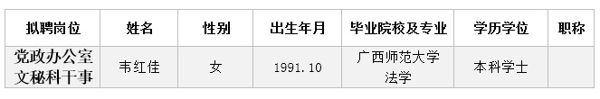 根据《关于印发<广西壮族自治区事业单位公开招聘人员实施办法>的通知》(桂人社发[2011]155号)及《广西银行学校2018年冬季公开招聘非实名制人员公告》的有关规定,通过报名、资格审查、考试、考核、体检等程序,经研究决定,拟聘韦红佳同志为万象城官网工作人员。现将拟聘用人员名单予以公示,公示时间为2019年3月4日-2019年3月12日,如有异议,请于3月12日下午5:00前以书面形式并署真实姓名反馈到学校纪委或组织人事处。联系地址:广西南宁市大学东路91号,邮政编码:530007,联系电话:0771—3240084,0771—3278961。