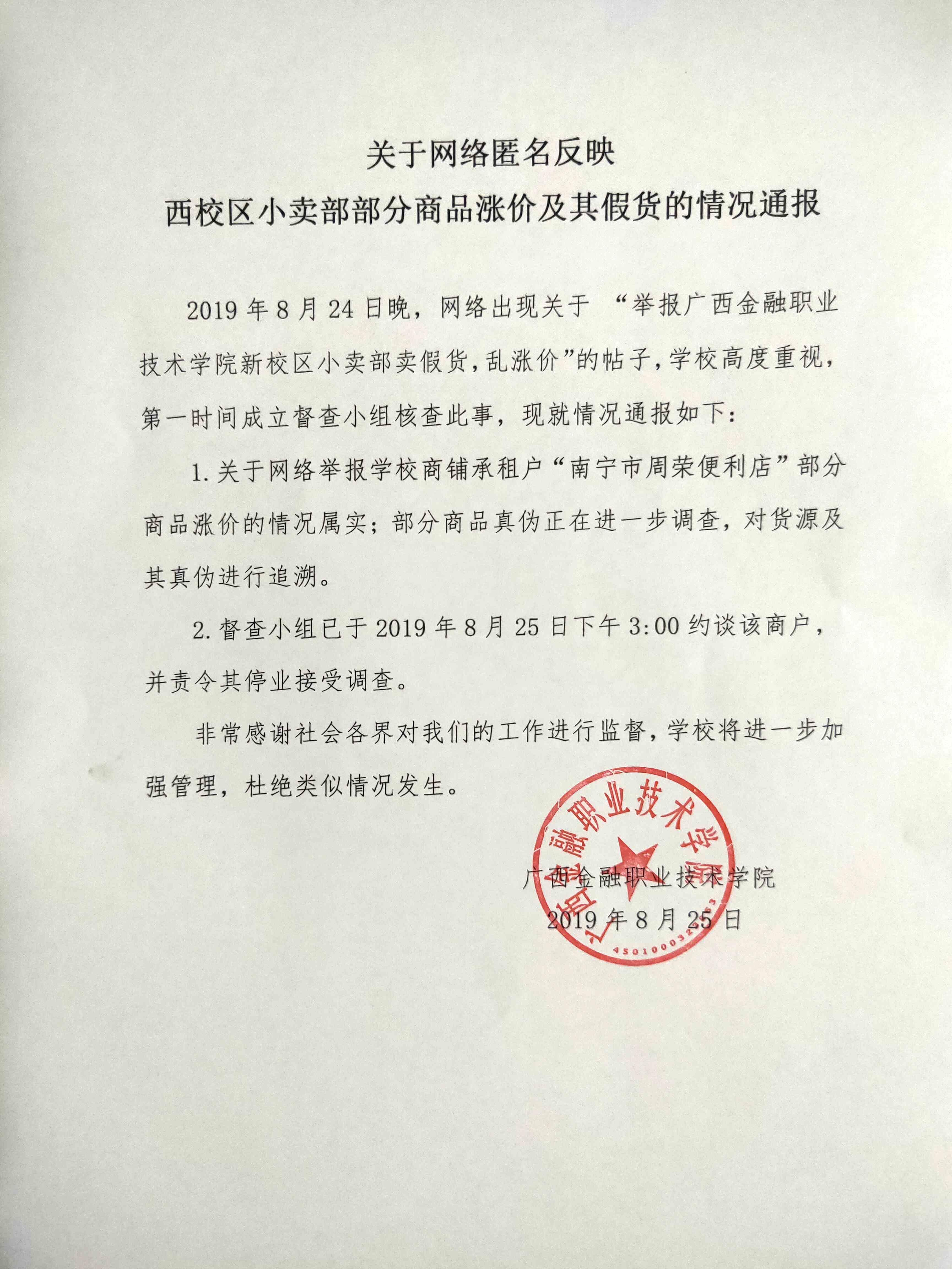 关于网络匿名反映西校区小卖部部分商品涨价及其假货的情况通报