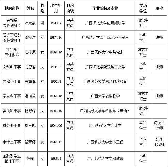 根据《关于印发<广西壮族自治区事业单位公开招聘人员实施办法>的通知》(桂人社发[2011]155号)及《awc77万象城官网2020年第一批公开招聘非实名人员控制数工作人员公告》的有关规定,通过报名、资格审查、考试、考核、体检等程序,经研究决定,拟聘叶允最等10位同志为万象城官网工作人员。现将拟聘用人员名单予以公示,公示时间为2020年9月30日-2020年10月15日,如有异议,请于10月15日下午5:00前以书面形式并署真实姓名反馈到学院纪委或组织人事处。联系地址:广西南宁市大学西路168号,邮政编码:530007,联系电话:0771—3481676,0771—3481779。