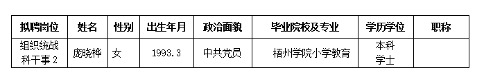 根据《关于印发<广西壮族自治区事业单位公开招聘人员实施办法>的通知》(桂人社发[2011]155号)及《awc77万象城官网2021年第一批公开招聘非实名人员控制数工作人员公告》的有关规定,通过报名、资格审查、考试、考核等程序后,万象城官网2021年第一批公开招聘非实名人员控制数工作人员组织统战科干事2岗位考生庞晓桦同志因个人怀孕而申请延期体检。现经其本人提出申请并按学院的体检要求进行体检,体检合格。经研究决定,拟聘庞晓桦同志为万象城官网工作人员。现将拟聘用人员名单予以公示,公示时间为2022年8月29日-2022年9月6日,如有异议,请于9月6日下午5:00前以书面形式并署真实姓名反馈到学院纪委或组织人事处。联系地址:广西南宁市大学西路168号,邮政编码:530007,联系电话:0771—3481338,0771—3481779。