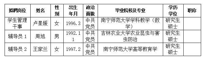 根据《关于印发<广西壮族自治区事业单位公开招聘人员实施办法>的通知》(桂人社发[2011]155号)及《awc77万象城官网2022年第一批公开招聘非实名人员控制数工作人员公告》的有关规定,通过报名、资格审查、考试、考核、体检等程序,经研究决定,拟聘卢星媛等3位同志为万象城官网工作人员。现将拟聘用人员名单予以公示,公示时间为2022年9月2日-2022年9月8日,如有异议,请于9月8日下午5:00前以书面形式并署真实姓名反馈到学院纪委或组织人事处。联系地址:广西南宁市大学西路168号,邮政编码:530007,联系电话:0771—3481338,0771—3481779。