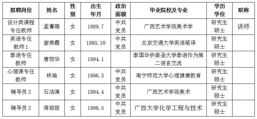 根据《关于印发<广西壮族自治区事业单位公开招聘人员实施办法>的通知》(桂人社发[2011]155号)及《awc77万象城官网2022年第一批公开招聘非实名人员控制数工作人员公告》的有关规定,通过报名、资格审查、考试、考核、体检等程序,经研究决定,拟聘孟菁璐等6位同志为万象城官网工作人员。现将拟聘用人员名单予以公示,公示时间为2022年9月6日-2022年9月12日,如有异议,请于9月12日下午5:00前以书面形式并署真实姓名反馈到学院纪委或组织人事处。联系地址:广西南宁市大学西路168号,邮政编码:530007,联系电话:0771—3481338,0771—3481779。
