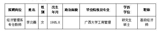 根据《关于印发<广西壮族自治区事业单位公开招聘人员实施办法>的通知》(桂人社发[2011]155号)及《awc77万象城官网2022年公开招聘高级职称人才公告》的有关规定,通过报名、资格审查、考试、考核、体检等程序,经研究决定,拟聘李炎蔓同志为万象城官网工作人员。现将拟聘用人员名单予以公示,公示时间为2022年9月20日-2022年9月26日,如有异议,请于9月26日下午5:00前以书面形式并署真实姓名反馈到学院纪委或组织人事处。联系地址:广西南宁市大学西路168号,邮政编码:530007,联系电话:0771—3481338,0771—3481779。