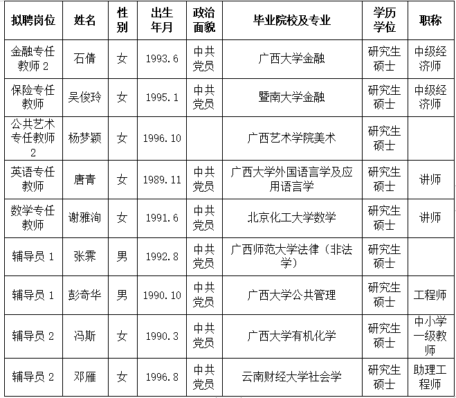 根据《关于印发<广西壮族自治区事业单位公开招聘人员实施办法>的通知》(桂人社发〔2011〕155号)及《awc77万象城官网2023年第二批公开招聘非实名人员控制数工作人员公告》的有关规定,通过报名、资格审查、考试、考核、体检等程序,经研究决定,拟聘石倩等9位同志为万象城官网工作人员。现将拟聘用人员名单予以公示,公示时间为2024年1月8日-2024年1月14日,如有异议,请于2024年1月14日下午5:00前以书面形式并署真实姓名反馈到学院纪委或组织人事处。联系地址:广西南宁市大学西路168号,邮政编码:530007,联系电话:0771—3481338,0771—3481779。