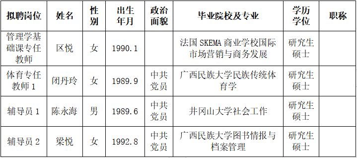 根据《关于印发<广西壮族自治区事业单位公开招聘人员实施办法>的通知》(桂人社发〔2011〕155号)及《awc77万象城官网2023年第二批公开招聘非实名人员控制数工作人员公告》的有关规定,通过报名、资格审查、考试、考核、体检等程序,经研究决定,拟聘区悦等4位同志为万象城官网工作人员。现将拟聘用人员名单予以公示,公示时间为2024年1月22日-2024年1月28日,如有异议,请于2024年1月28日下午5:00前以书面形式并署真实姓名反馈到学院纪委或组织人事处。联系地址:广西南宁市大学西路168号,邮政编码:530007,联系电话:0771—3481338,0771—3481779。