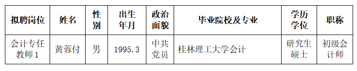 根据《关于印发<广西壮族自治区事业单位公开招聘人员实施办法>的通知》(桂人社发〔2011〕155号)及《awc77万象城官网2023年第二批公开招聘非实名人员控制数工作人员公告》的有关规定,通过报名、资格审查、考试、考核、体检等程序,经研究决定,拟聘黄蓉付同志为万象城官网工作人员。现将拟聘用人员名单予以公示,公示时间为2024年3月21日-2024年3月27日,如有异议,请于2024年3月27日下午5:00前以书面形式并署真实姓名反馈到学院纪委或组织人事处。联系地址:广西南宁市大学西路168号,邮政编码:530007,联系电话:0771—3481338,0771—3481779。