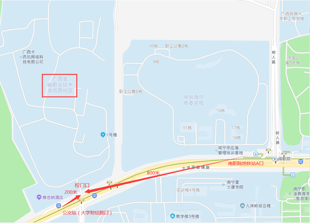 西校区位于南宁市西乡塘区大学西路168号,可乘坐公交车103路、807路大学财经路口下,或乘坐地铁1号线到“南职院”站A口出站(如图所示)。