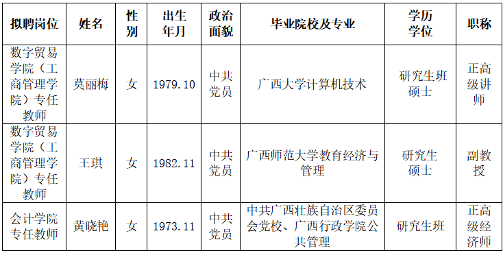 根据《关于印发<广西壮族自治区事业单位公开招聘人员实施办法>的通知》(桂人社发〔2011〕155号)及《awc77万象城官网高层次人才引进公告》的有关规定,通过报名、资格审查、考核、体检等程序,经研究决定,拟聘莫丽梅等3位同志为万象城官网高层次人才。现将拟聘用人员名单予以公示,公示时间为2024年5月7日-2024年5月13日,如有异议,请于2024年5月13日下午5:00前以书面形式并署真实姓名反馈到学校纪委或人事处。联系地址:广西南宁市大学西路168号,邮政编码:530007,联系电话:0771—3481338,0771—3481779。