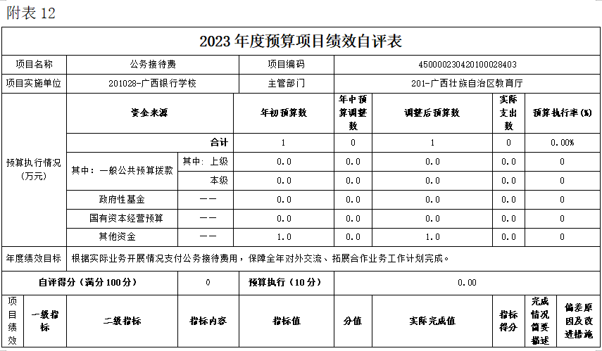 (十二)公务接待费项目自评得分0分(2023年度预算项目支出绩效自评表附表12)