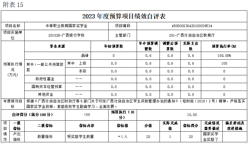 (十五)中等职业教育国家奖学金项目自评得分100分(2023年度预算项目支出绩效自评表附表15)