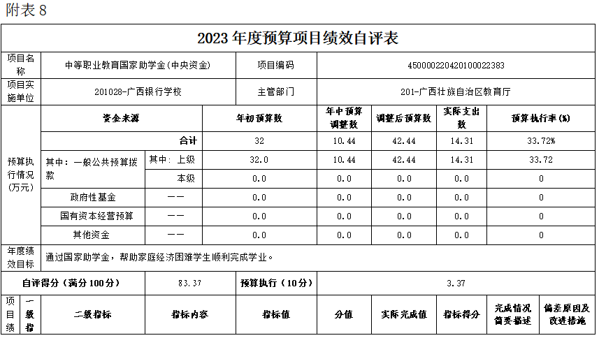 (八)中等职业教育国家助学金(中央资金)项目自评得分83.37分(2023年度预算项目支出绩效自评表附表8)