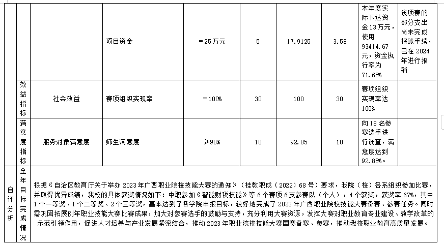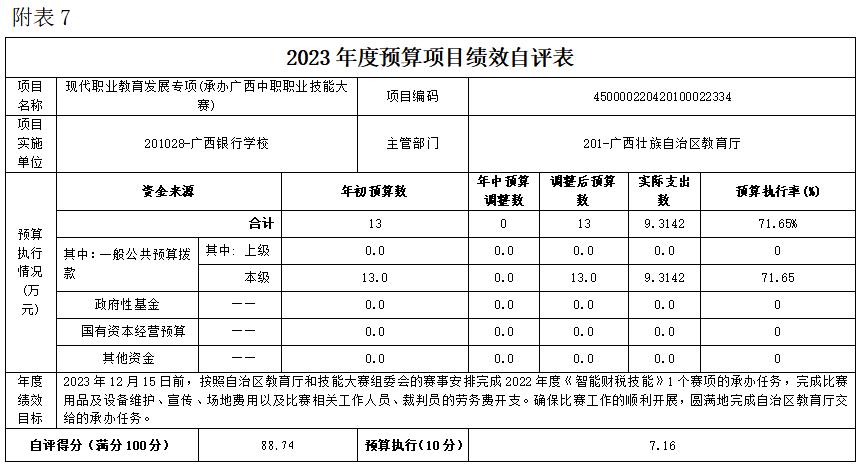 (七)现代职业教育发展专项(承办广西中职职业技能大赛)项目自评得分88.74分(2023年度预算项目支出绩效自评表附表7)