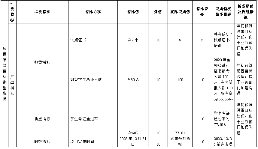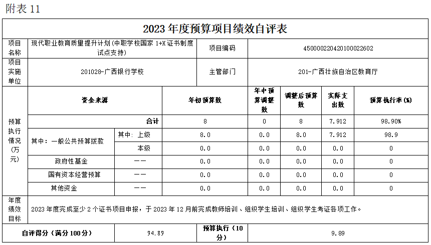 (十一)现代职业教育质量提升计划(中职学校国家1+X证书制度试点支持)项目自评得分94.89分(2023年度预算项目支出绩效自评表附表11)