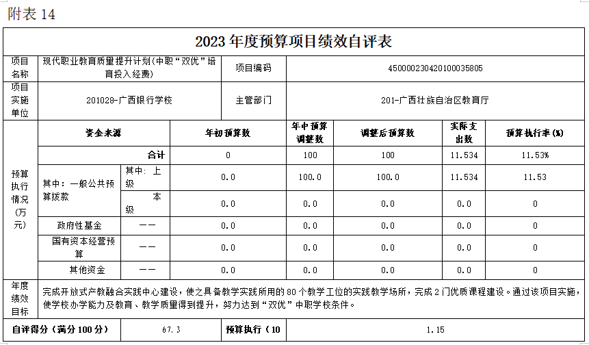 (十四)现代职业教育质量提升计划(中职“双优”培育投入经费)项目自评得分67.3分(2023年度预算项目支出绩效自评表附表14)
