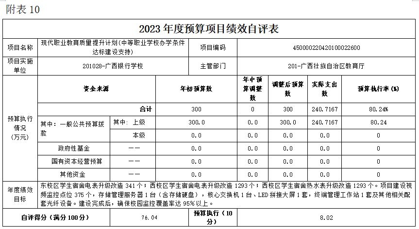 (十)现代职业教育质量提升计划(中等职业学校办学条件达标建设支持)项目自评得分76.04分(2023年度预算项目支出绩效自评表附表10)