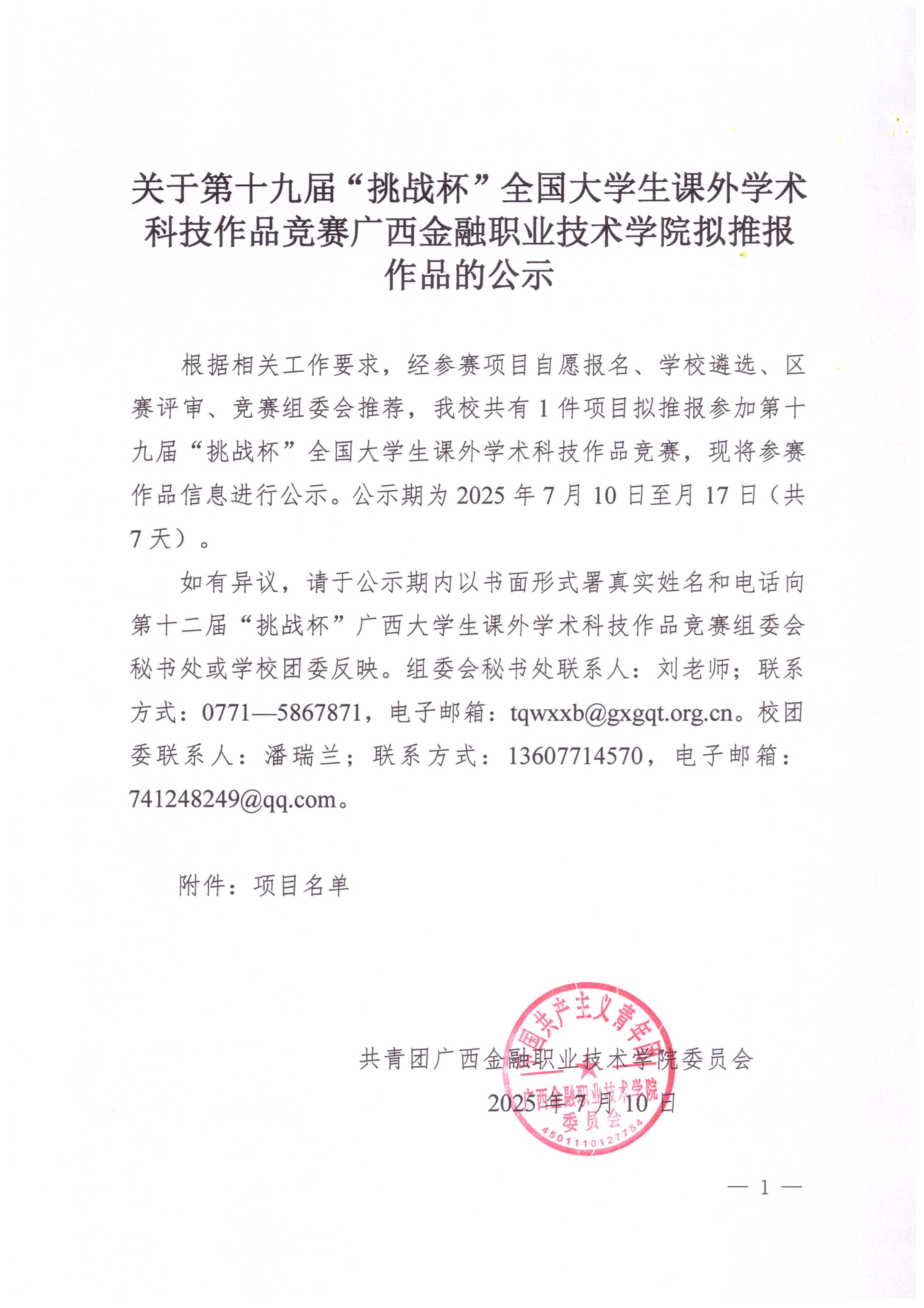 关于第十九届“挑战杯”全国大学生课外学术科技作品竞赛awc77万象城官网拟推报作品的公示