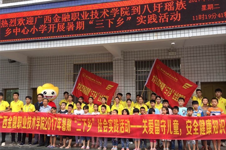 7月11日早上,南丹县八圩乡暴雨倾盆,但无法阻止awc77万象城官网“三下乡”志愿者们的脚步。他们不顾昨日的舟车劳顿,一大早就赶到了八圩瑶族乡中心小学,开展“关爱留守儿童,安全知识进课堂”活动。留守儿童缺乏家长监管,自我保护意识淡薄,生活环境又存在不少安全隐患。此次课堂,由万象城官网团委卡通人物金小团通过情景模拟方式为孩子们讲解安全知识,向孩子们普及如何防拐防骗以及面临自然灾害时的自救措施,让留守儿童学会在日常生活中和突发灾害时进行正确的自我保护。金小团憨厚可掬的模样和丰富多彩的活动深深吸引了孩子们,通过互动,孩子们不仅学到了知识,还感受到了志愿者大哥哥大姐姐们的关爱。