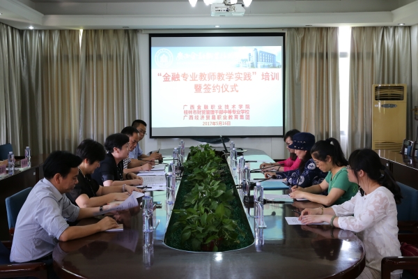 5月16日,万象城官网与桂林市财贸管理干部中等专业学校在学校五楼会议室开展“金融专业教师教学实践”培训暨签约仪式活动。校长沈立君、副校长谢沛善与各系主任出席会议,桂林市财贸管理干部中等专业学校副校长何燕一行五人参加了会议。会议由沈立君校长主持。