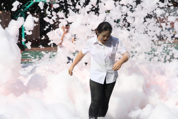 泡泡跑活动源自美国,活动使用的泡泡由纯自然椰油、可降解原料以及可食用色素制作,对身体无任何影响,安全无污染。活动当天,院团委在活动现场设置了两台超大功率的泡泡机。参赛者们身着浅色衣服,早早来到活动现场,迫不及待要参加活动。活动开始后,泡泡机不停喷涌出五颜六色的泡泡,很快布满了整个跑道。同学们在一声令下,在泡泡的海洋里沿着既定路线欢乐奔跑,尽情释放青春活力,在炎炎夏日享受一份难得的清凉。