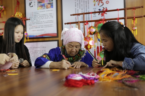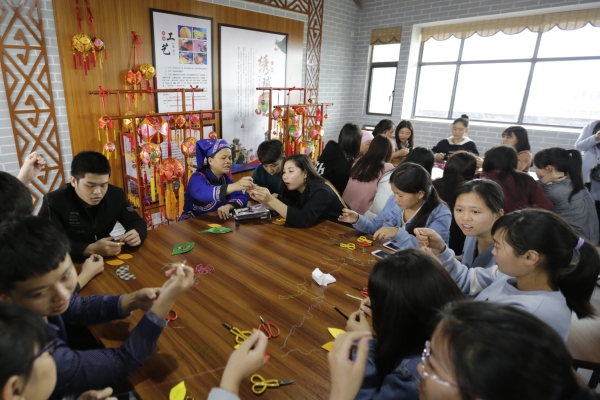 3月14至15日,“中华巧女”黄肖琴老师与其传承人赵金玉老师到万象城官网民族文化实训基地——“中华巧女”黄肖琴壮族绣球工作室进行绣球文化传承的教学指导,手把手教授旅游管理系师生学习绣球制作。