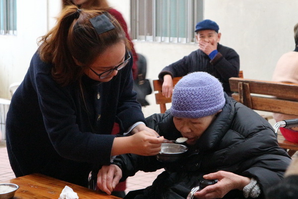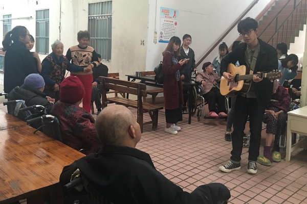 随后,志愿者与老人们围坐在一起进行亲切的交谈,给老人们拉家常,讲笑话;为老人们弹奏吉他;帮助老人们舒展筋骨;给老人们喂食……看到老人们灿烂的笑容,听着老人们爽朗的笑声,志愿者们充分体会到“老吾老以及人之老”的深刻含义,更加坚定了要继续服务社会的决心。