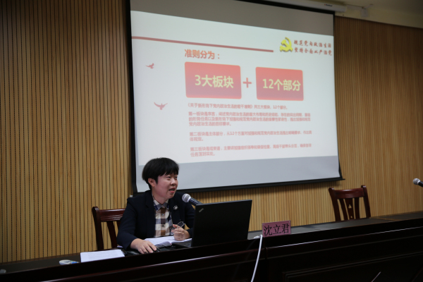 沈立君院长对《关于新形势下党内政治生活的若干准则》(以下简称《准则》)进行了深刻解读,从制定的背景和目的、五大特点和关键内容、贯彻落实的具体举措等方面强调了《准则》的重要意义,并要求全体党员干部要认真领会《准则》的精神实质,不断提高思想意识,自觉遵守党的纪律,在思想上政治上行动上同以习近平同志为核心的党中央保持高度一致。