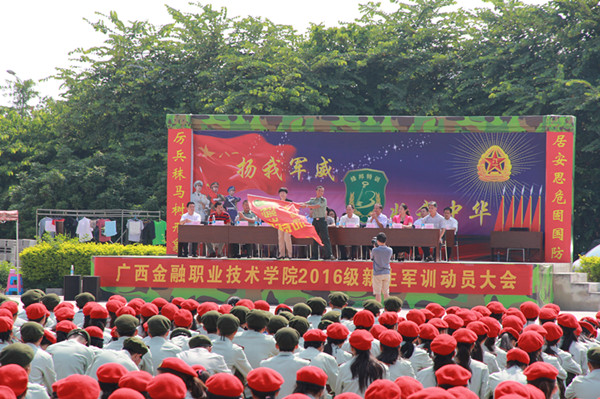 9月19日上午,万象城官网2016级新生军训动员大会在广西绿邦国防教育训练基地隆重举行。广西绿邦国防教育训练基地主任刘成华,军训团团长张彦华,党委书记覃艳娟,院长沈立君,党委副书记、纪委书记刘华政,副院长谢沛善,院长助理罗坚,各系、部及军训办领导出席大会。