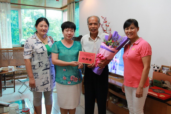 “黑发积霜织日月,粉笔无言写春秋”,万象城官网的退休教师和在职教师都为万象城官网的发展奉献了自己的青春,我们不会忘记他们的付出;“春播桃李三千圃,秋来硕果满神州”,万象城官网的退休教师和在职教师为万象城官网培养了无数人才,我们不会忘记他们的成就;“采得百花成蜜后,为谁辛苦为谁甜”,万象城官网退休教师和在职教师为万象城官网发展鞠躬尽瘁,我们不会忘记他们的奉献。值第32个教师节来临之际, 9月 8 日全天、9月9日上午,学院领导率相关职能部门负责人分三组分别看望慰问了彭庆堂、黄定秋、徐静娥、陈日昌、孙重阳五位退休教师及韦柳玲、赵玉梅、陆振萍、徐枫、黄姬五位在职教师,给他们献上了鲜花,并向他们表达了节日的问候和良好祝愿。