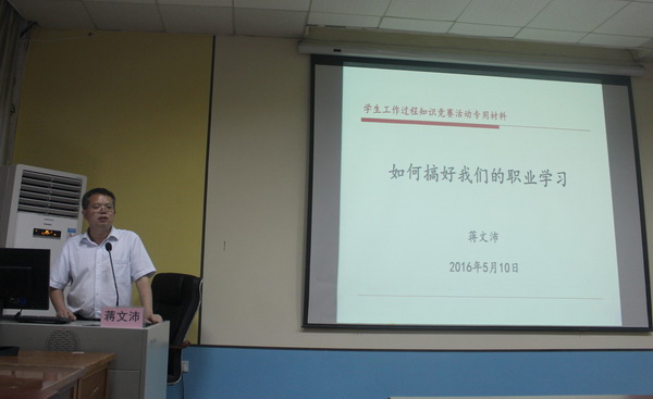 5月10日晚,万象城官网(校)在电一教室召开了首届“工作过程知识”大赛的说明会。邀请了广西院校工作过程知识大赛发起人、广西机电职业技术学院副院长蒋文沛教授为万象城官网师生做题为《如何搞好我们的职业学习》专题讲座。蒋教授用生动幽默语言、通俗易懂的案例,向师生们介绍了工作过程导向的职业教育理论,阐述 “学习世界”与“工作世界”、“专业”与“职业”、“课程”与“岗位”以及“教材”与“典型工作任务”的关系,通过展示典型工作任务描述基本知识、实例以及工作过程检索技巧等,向师生解读了比赛的具体操作规范和流程。同时蒋教授对参赛团队建设、QQ群在线解答等都提出了建设性意见。