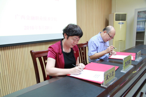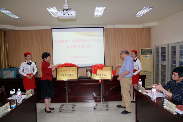 研讨环节结束后,沈立君院长与区小额贷款公司协会会长肖桂柳签署了校会战略合作协议,并一起为“awc77万象城官网校会合作基地”和 “广西小额贷款公司协会校会合作基地”两块牌匾揭牌。