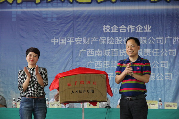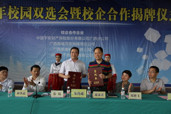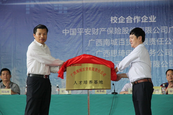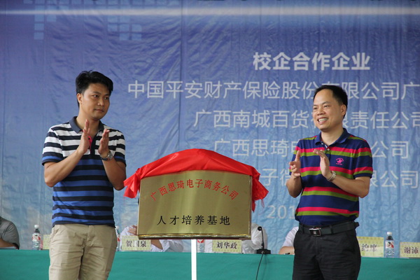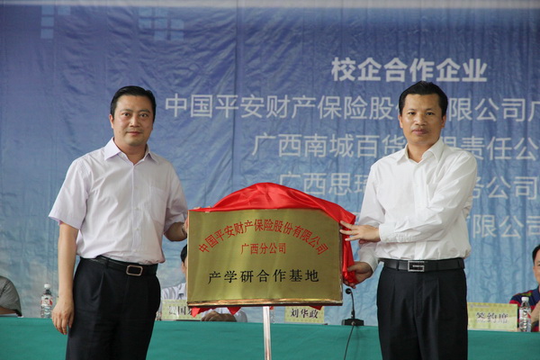 刘华政副书记、谢沛善副院长分别与中国平安财产保险股份有限公司广西分公司、广西南城百货有限责任公司、广西思琦电商公勇,南宁格子微投资有限公司等企业进行了校企合作揭牌仪式。