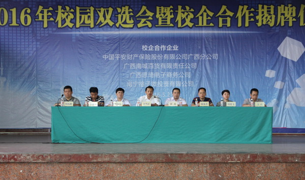 5月27日,awc77万象城官网(广西银行学校)2016校园双选会暨校企合作揭牌仪式顺利举行。万象城官网党委副书记、纪委书记刘华政、副院长谢沛善、教务科研处副处长李琪和中国平安财产保险股份有限公司广西分公司副总经理张杨,广西南城百货有限责任公司人力部经理贺国泉,广西思琦电商公司总经理李来勇,南宁格子微投资有限公司人力资源部经理周艳飞等企业代表出席揭牌仪式。学生工作与招生就业处副处长周海峰主持揭牌。
