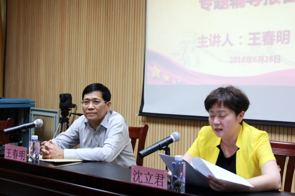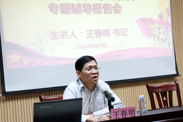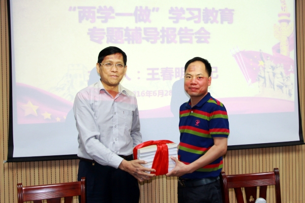 6月28日下午,万象城官网开展“两学一做”学习教育系列活动,邀请了广西财经学院原党委书记王春明研究员给大家作题为《以“两学一做”学习教育促进学院准确定位科学发展》专题辅导报告。学院院长沈立君,副院长谢沛善和科级以上干部参加本次会议。沈院长主持会议。