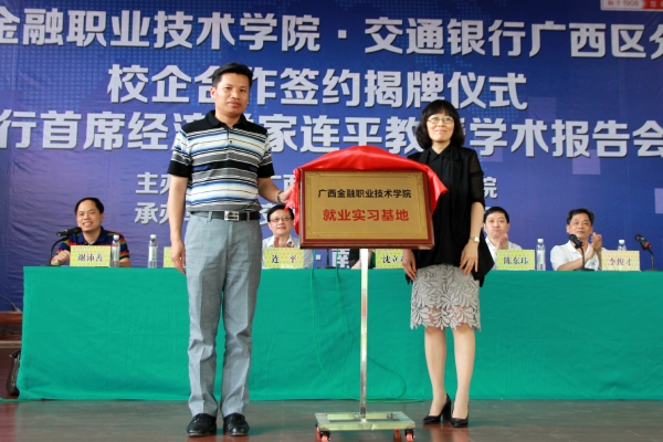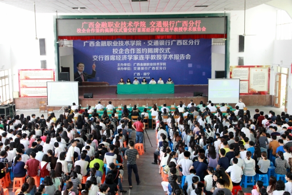 4月25日,万象城官网与交通银行广西分行在院大礼堂召开“金融精英面对面”校企合作签约揭牌仪式暨连平教授学术报告会。自治区教育厅职成处李俊才,交通银行首席经济学家连平教授,交通银行广西分行副行长陈东玮,交通银行广西分行副行长凌敏杰,学院院长沈立君,党委副书记、纪委书记刘华政,副院长谢沛善出席会议,万象城官网师生代表参加会议。会议由谢沛善副院长主持。