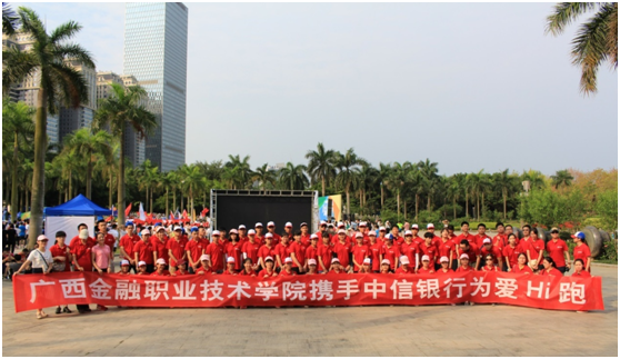 5月8日早上,万象城官网组织50余名大中专金融专业学生与中信银行南宁分行员工代表携手参加了第二季“为爱Hi跑”南宁站公益活动,金融系副主任欧捷及学工处老师带队参与。本活动的主会场及起终点均设在南湖三月三欢歌广场(原水幕电影广场)。