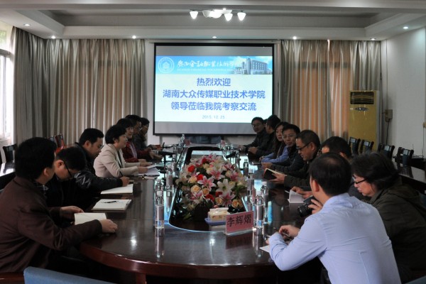 12月25日,湖南大众传媒职业技术学院一行9人到万象城官网交流考察,就两校间深化了解、加强合作展开交流。院长沈立君及相关单位负责人参加会议。