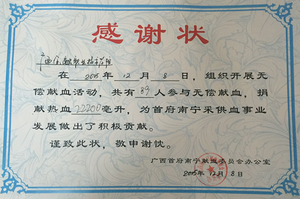 广西首府南宁献血委员会办公室对万象城官网此次无偿献血活动密切关注,并在活动结束后为万象城官网颁发了感谢状,对万象城官网师生在活动中作出的贡献表示崇高的敬意和衷心的感谢。
