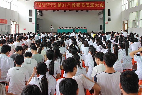 表彰大会在庄严的国歌声中拉开帷幕。会议首先由学生代表进行诗朗诵,并给老教师献上鲜花。大会宣读了《关于表彰2014年度广西银行学校十佳教师的决定》、《关于表彰2014年度广西银行学校十佳服务之星的决定》、《关于表彰2014年度广西银行学校先进工作者的决定》、《关于表彰2014-2015学年上学期优秀班主任的决定》、《关于表彰2014年广西银行学校工会积极分子、工会先进小组的决定》、各类科研及各类竞赛获奖集体、个人表彰名单以及《关于聘任2015年带教老师、带教班主任的通知》。学院(校)领导班子为“先进集体” 、“先进个人”、 “十佳服务之星”、“十佳教师”、“优秀班主任”代表、“工会积极分子”、“先进工会小组” 颁奖。