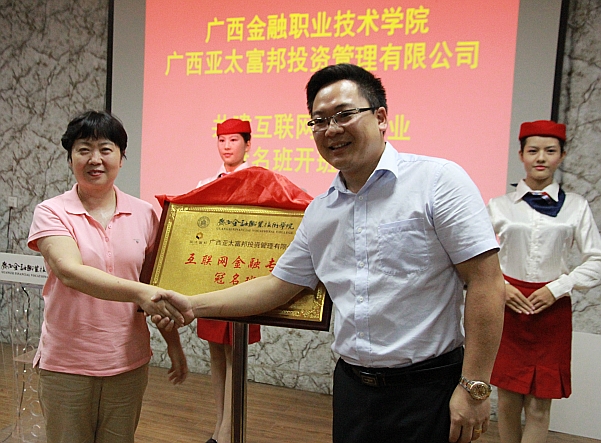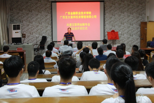 2015年9月6日晚19点30分,awc77万象城官网与广西亚太富邦投资管理有限公司合作的冠名班——互联网金融专业班开班仪式在电教一楼隆重举行。在40名互联网金融班同学的热烈掌声中,迎来了出席开班仪式的合作双方领导,有awc77万象城官网沈立君院长、刘华政副书记,金融系、投资保险系、计算机系、学工部门的相关领导及教师代表,以及广西亚太富邦投资管理公司的王宋亭董事长、郭爱国总经理、崔洪亮副总经理,以及公司各职能部门的领导一行人。