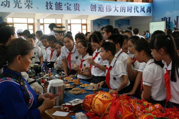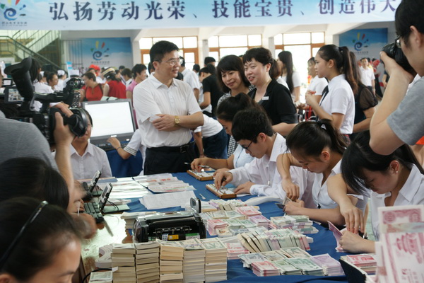 启动仪式后,全区各中高职学校代表在万象城官网大礼堂进行了技能展示活动,并邀请来自社区和清川小学的学生和家长进行现场观摩。其中万象城官网的点钞、翻打传票、真 假 币 识别、动漫制作、恭城油茶制作、民族绣球工艺、咖艺等技能展示受到学生和家长的热烈欢迎,争先恐后的想要一睹为快,各展示台均门庭若市。同时,受到自治区教育厅领导的一致好评。