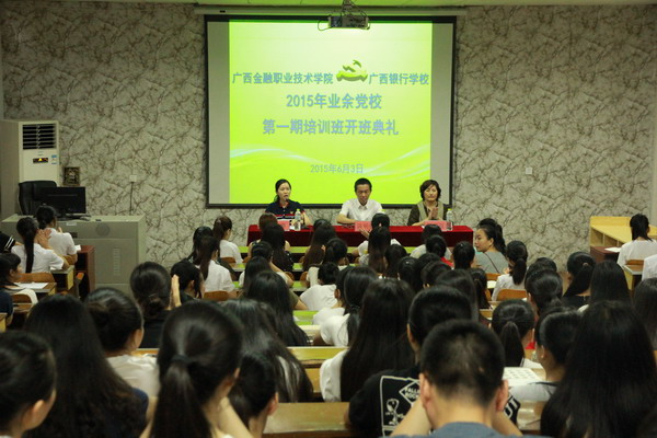 6月3日下午5:00分,awc77万象城官网(广西银行学校)在电教一楼多媒体教室隆重举行了2015年第一期业余党校培训班开班典礼,学校党委副书记、纪委书记陈明健、党政办公室主任韩蓓丽、副主任陶琳出席了开班典礼。会议由党政办副主任陶琳主持。