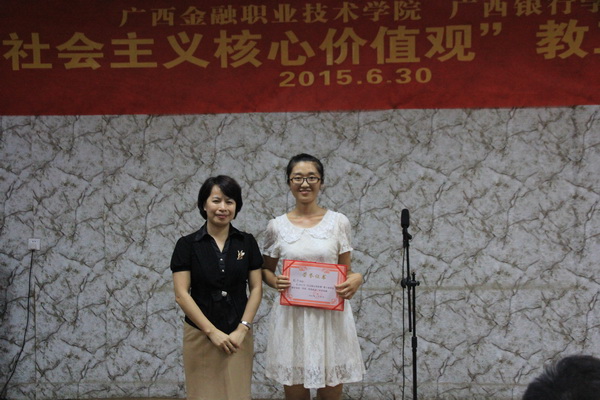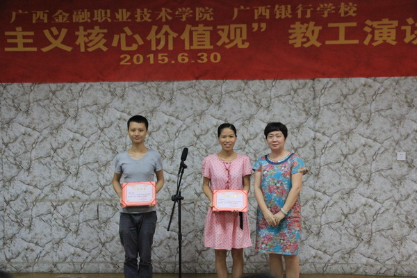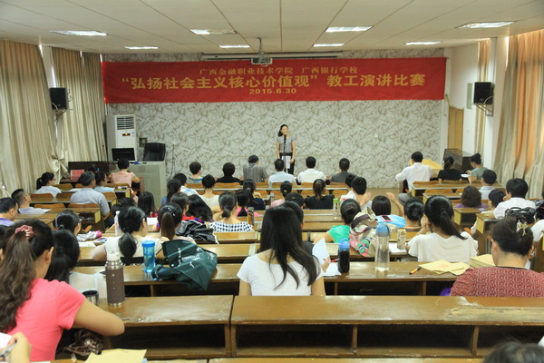 为更好地贯彻落实党的十八大和十八届三中、四中全会精神,迎接中国共产党建党94周年和丰富校园文化生活,awc77万象城官网(广西银行校),于6月30日下午在电教一楼多媒体教室组织举办了一场“弘扬社会主义核心价值观”教工演讲比赛。