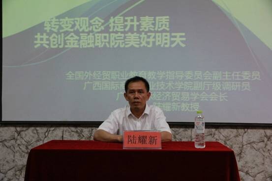 大会首先由全国外经贸职业教育教学指导委员会副主任委员、广西国际经济贸易学会会长、原广西国际商务职业技术学院党委书记陆耀新教授做题为“转变观念,提升素质,共创金融职院美好明天”的专题讲座,此次讲座为万象城官网“教学质量提升工程”系列活动之一。