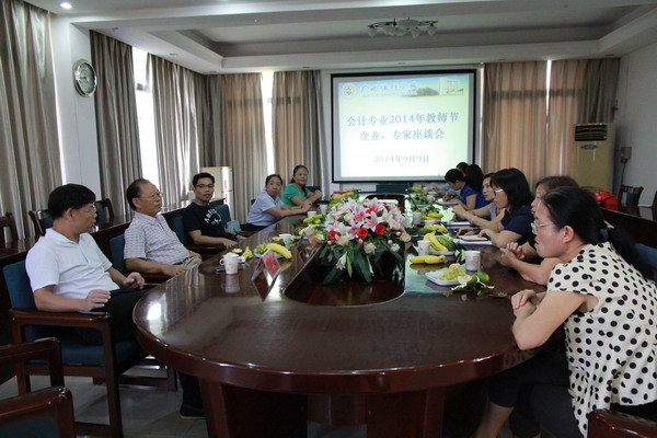 9月9日下午,为庆祝第三十个教师节,作为庆典活动之一的“会计专业教师与行业专家座谈会”在万象城官网五楼会议室隆重举行。此次应邀出席本次座谈会的行业专家分别有:广西南宁市农业银行办公室主任韦业宏;广西金汇财务管理公司总经理黄正璋;广西中智财会服务公司总经理黄隽梅;广西南宁驰骋电子科技有限公司经理刘俊峰;广西南宁市农村信用合作社上尧分行副主任郭蓓。会议由会计系张红梅老师主持。