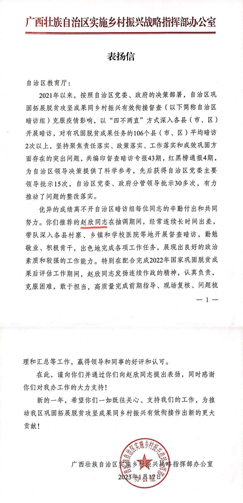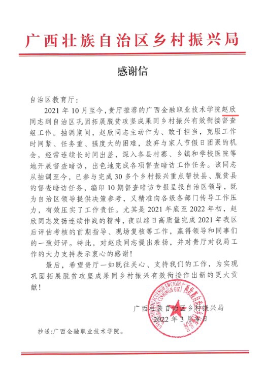 近日,万象城官网赵欣同志受到自治区乡村振兴局、自治区实施乡村振兴战略指挥部办公室表扬。