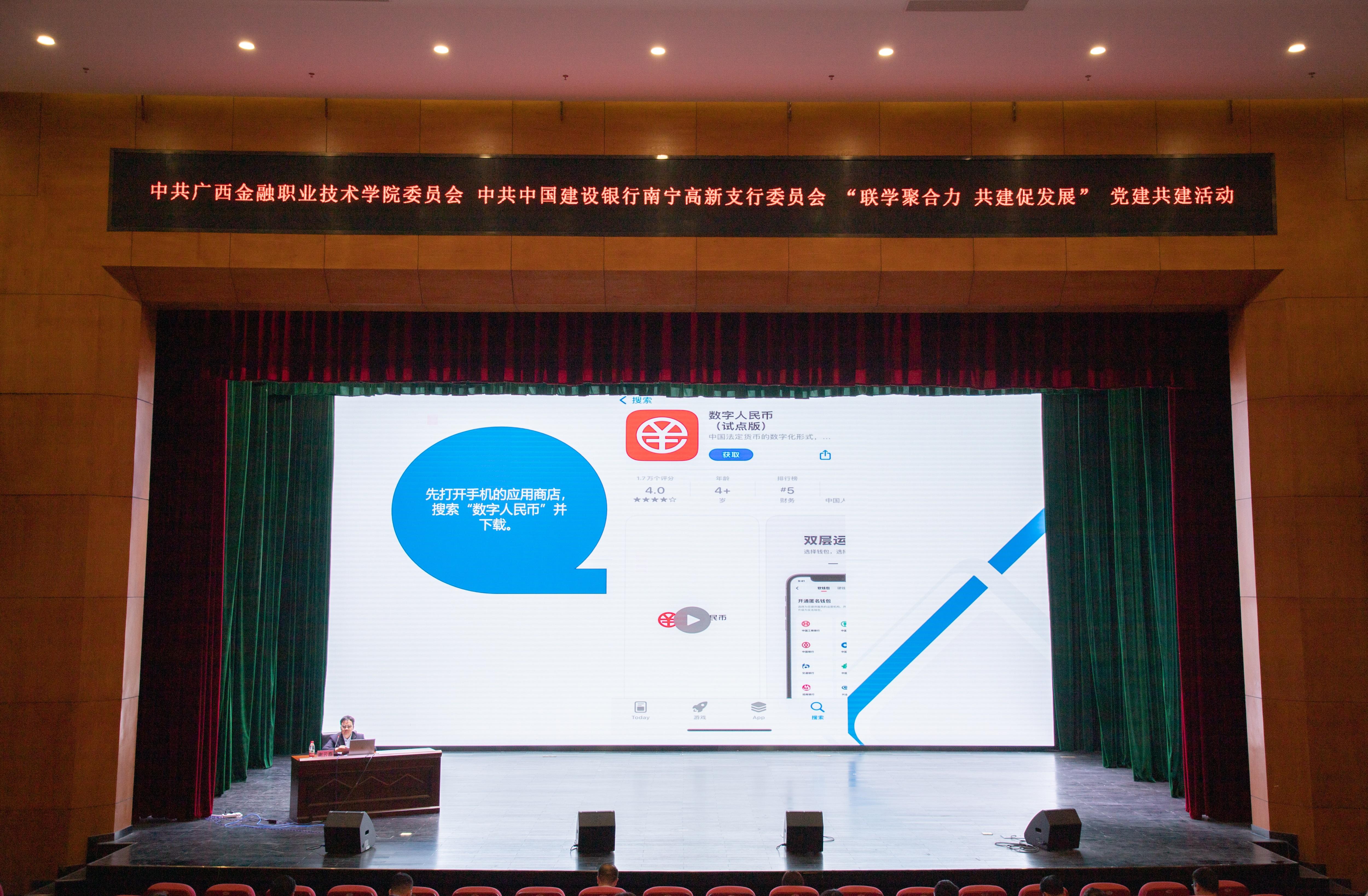 签约仪式后,由建设银行广西区分行网络金融部谢云磊经理为参会全体师生进行了数字人民币知识讲座,介绍了数字人民币的概念、功能及与常见移动支付手段的异同等,围绕数字货币的含义、价值和使用方法向师生作了详细讲解。