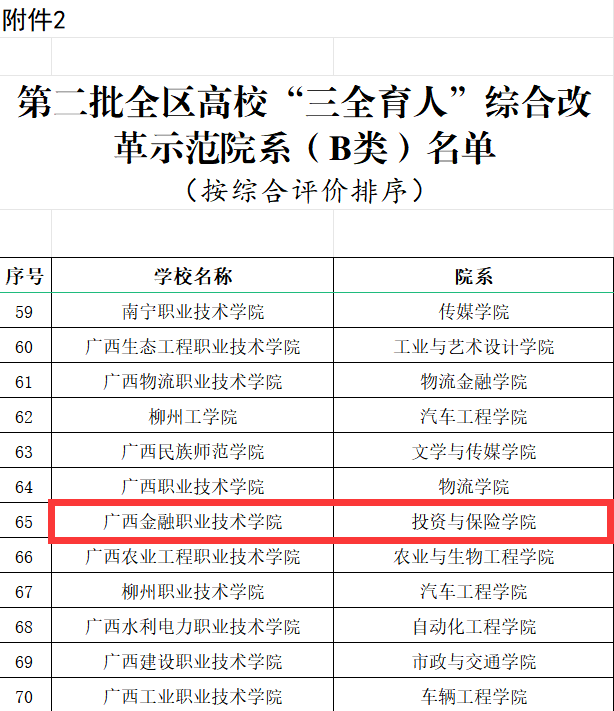 近日,自治区教育厅公布了第二批全区高校“三全育人”综合改革示范院系名单,万象城官网投资与保险学院入选广西高校“三全育人”综合改革示范院系。