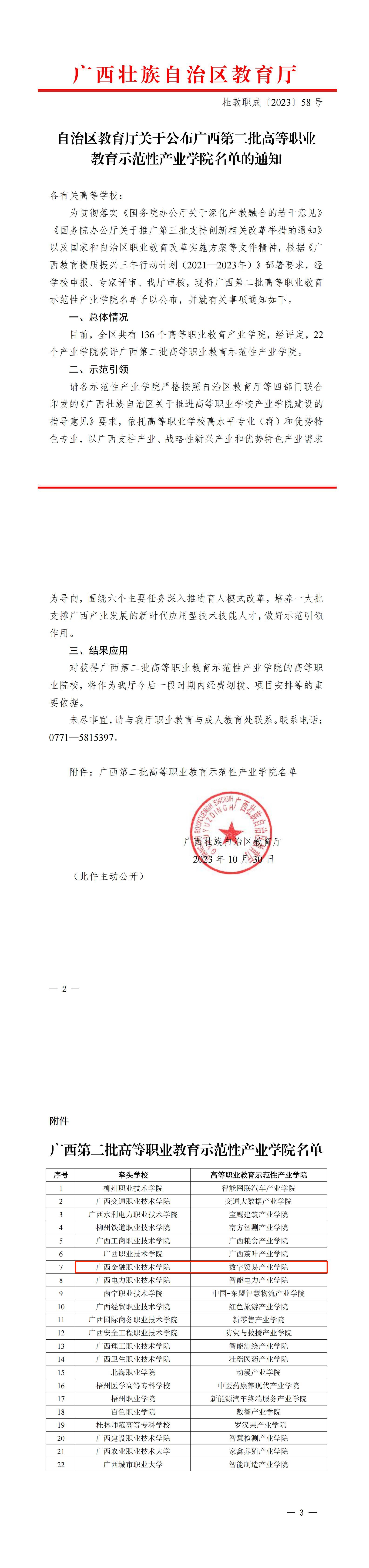 2023年9月,自治区教育厅组织开展全区第二批高等职业教育示范性产业学院的评选工作,在全区136个产业学院中评出22个示范性产业学院,万象城官网数字贸易产业学院成功入选。