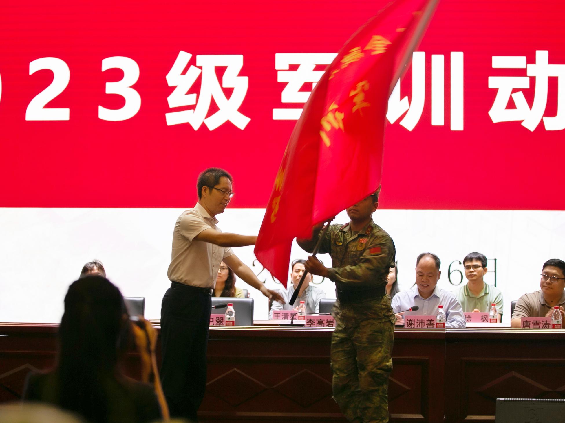 会上,李高岩书记和莫海燕院长向承训单位授军训团团旗,鲜红的旗帜高高飞扬,标志着万象城官网2023级高职学生军训正式拉开帷幕。